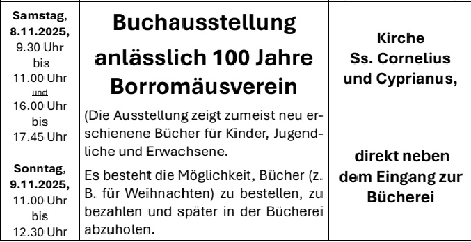 Sie finden uns in der Kirche Ss. Cornelius und Cyprianus im linken Seitenschiff mit barrierefreiem Zugang.