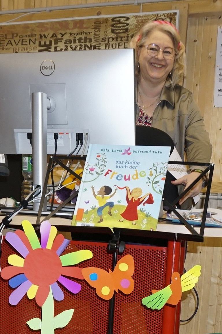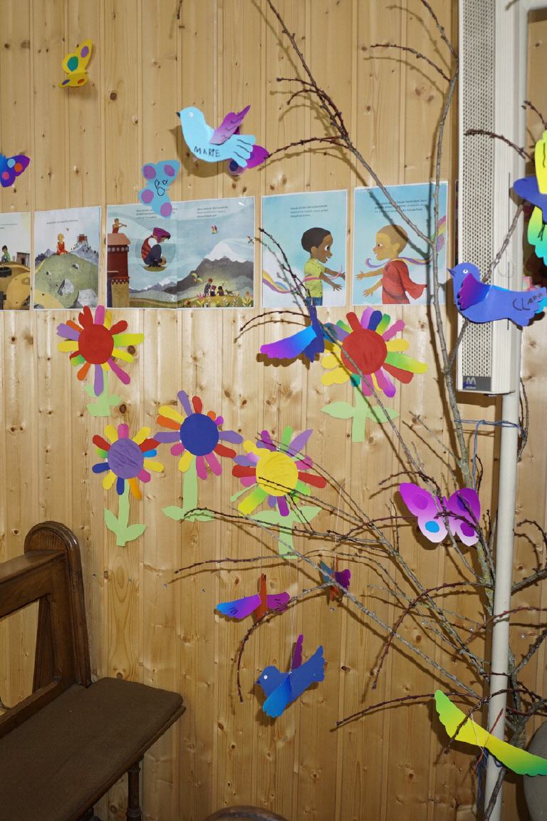 Die Mitarbeiterinnen der KÖB, Ulla Keuper und Felicitas Birkwald, haben mit den Vorschulkindern der Kita St. Christophorus zum Buch "Das kleine Buch der Freude" vom Dalai Lama und von Desmund Tuto Schmetterlinge, Vögel und Blumen gebastelt. Sie sind Zeichen dafür, dass sie ihre Augen und die Augen der Mitmenschen für die Freude öffnen wollen.